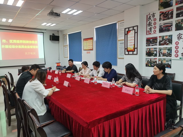 近日,民建界别市、区两级政协委员到天宁社区开展生活垃圾分类处理专项民主监督,与社区干部座谈,就前期暗访中发现的问题进行反馈并提出意见建议。