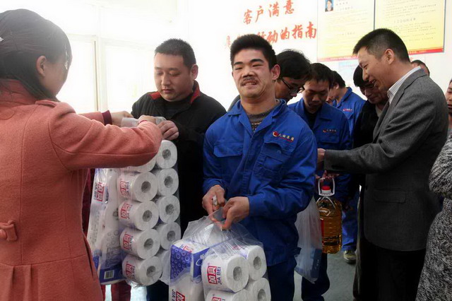 慰问组一行在参观了车间的过程中,对残疾职工用自己的劳动和汗水来获得自己的社会价值表示了崇高的敬意。民建北仑二支部副主委刘建军、贺蔚风和社区主任黄丹霞逐一向企业的残疾职工亲手送上日常生活所需的食用油、纸巾等慰问品。来自丽水的蓝宗春是一位脚有残疾的清洗工,重重的慰问品提在他手中虽然有点吃力,但是嘴里还不忘感谢大家对他的关怀和帮助。