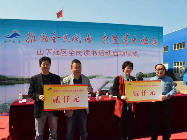 4月22日下午,在第二十个世界读书日即将到来之际,民建北仑二支部与结对协作共建的山下社区共同推出富有新意的全民读书活动启动仪式,在民建会员企业——宁波超胜电器制造有限公司举行。北仑区小港街道总工会主席方杏仁等领导与区委宣传部理论科、小港街道成人学校及民建北仑二支部部分会员,还有社区知源书屋负责人、社区居民、企业职工等100余人参加了启动仪式。