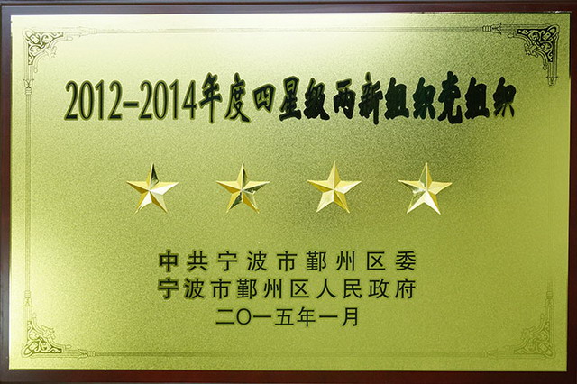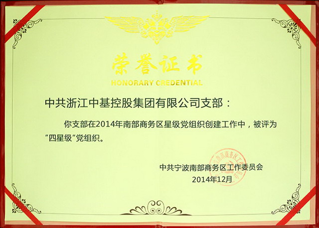 由中共宁波市鄞州区委、宁波市鄞州区人民政府颁发的2012-2014年度四星级两新组织党组织和中共宁波南部商务区工作委员会颁发的四星级党组织两项重要的荣誉奖牌及证书于近日正式下发。民建鄞州三支部会员企业——浙江中基控股集团有限公司党支部的荣誉榜上也由此增加了两个重要的奖项
