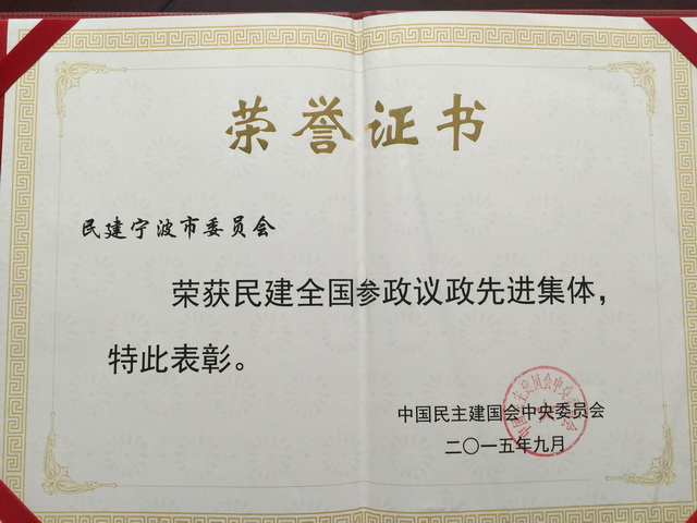 宁波民建荣获”民建全国参政议政先进集体“称号