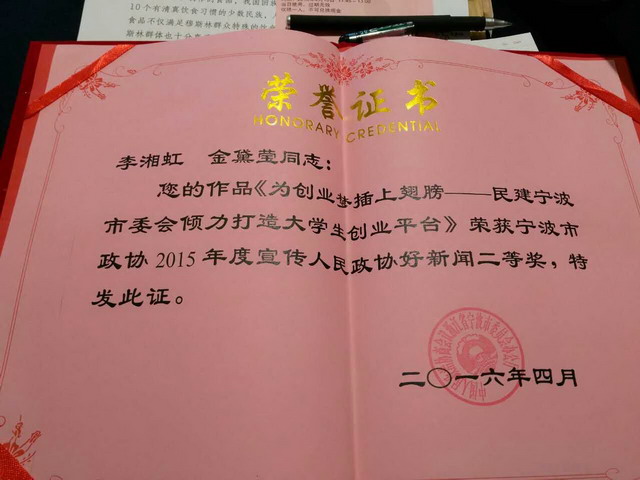近日,宁波市政协为2015年度宣传人民政协好新闻获奖名单位颁发荣誉证书,民建市委会选送的《为创业梦插上翅膀——民建宁波市委会倾力打造大学生创业平台》一文荣获二等奖。此文在团结报、联谊报、宁波日报、人民政协网等多家媒体报道,以民建大学生创业平台成立为契机,真实反应宁波民建响应“大众创业、万众创新”口号的成果,通过多方报道,宣传了宁波民建社会服务工作的成绩,以及党派组织良好社会形象。