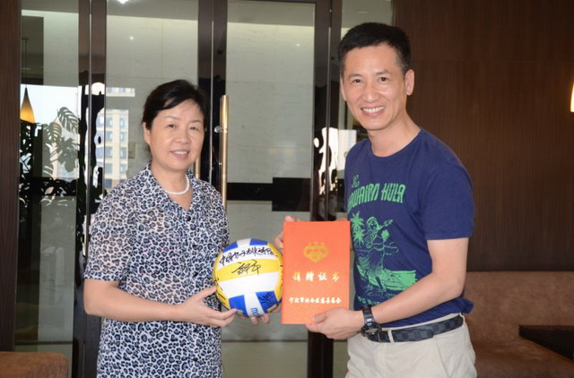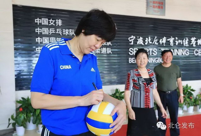 当时的中国女排在主教练郎平带领下,正在北仑国家排球训练基地备战2015年女排世界杯。出征前,郎平牵头与北仑区慈善总会联合举行了一场有特殊意义的慈善公益签赠仪式:由郎平和中国女排队员在排球上签名,并将这批签名排球赠送给北仑区慈善总会,然后通过拍卖,将善款用于公益事业。北仑区政协副主席、区慈善总会会长蒋素春当场为中国女排颁发了捐赠证书。