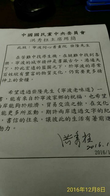 12月8日,海曙二支部会员柴隆收到来自台湾的读者---中国国民党中央委员会洪秀柱主席来信:“在苦难中找寻生机,在疑难中找到喜乐。宁波的城市精神是书藏古今、港通天下,于此宏远的蓝图之下,于宁波的寻常百姓纵有丰富的物质文化,仍需要更多精神上的食粮。希望透过柴隆先生《宁波老味道》一书,能有来自于宁波家乡的祝福,也希望两岸能够于经济、贸易交流之余,在文化上能更多所互动。期许两岸透过文字的纪念,书信的往来,让彼此的生活有着前进的动力。”