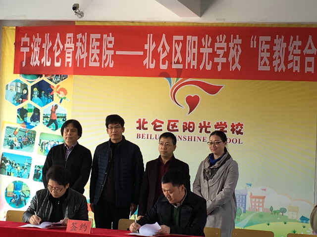2月28日上午,宁波北仑骨科医院与北仑区阳光学校举行“医教结合”签约仪式,两家单位牵手合作,为特殊孩子的康复训练贡献力量,共筑他们的健康成长之路。北仑区教育局副局长余智军、北仑区卫计局副局长张勤勇出席仪式并作了讲话。北仑骨科医院院长章飞与北仑区阳光学校校长顾盛宇互相签约。副董事长翁雪峰、副院长盛美霞等出席仪式。阳光学校全校师生到场见证。