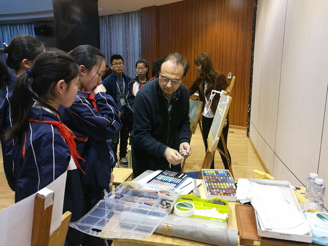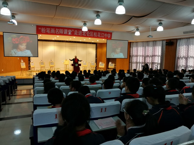 3月27日下午,“粉笔画名师课堂”校园主题活动在北仑区松花江中学综合楼顺利举行。“粉笔画名师课堂”由民建北仑一支部、北仑区松花江中学及苏州明加教育培训中心联合举办。活动邀请到了西班牙粉笔画协会会长胡赛•德尔•瑞格、西班牙粉笔画艺术家赫尔曼•那拉西利•波若纳特、西班牙粉笔画艺术家曼努埃尔•佩尼亚•苏亚雷斯、西班牙粉笔画艺术家欧亨尼奥•麦耶尔、中国民建会员美国国家水彩家协会会员裴发邦等知名大师,他们为学校师生带来精彩的演讲与表演。在粉笔画表演环节,校方安排了20名中学生与大师同台一起创作粉笔画,场面十分热闹。