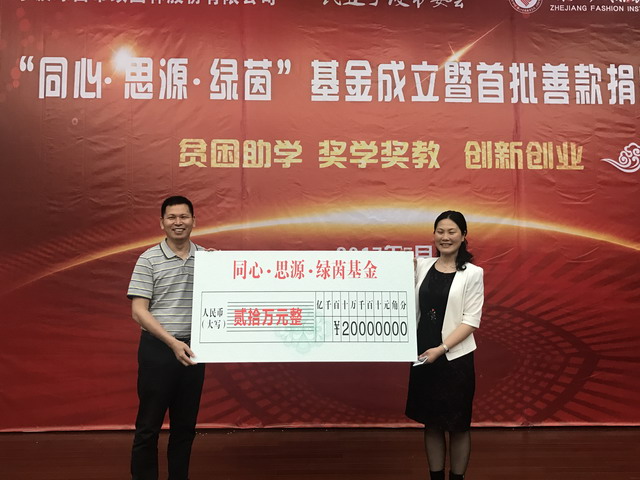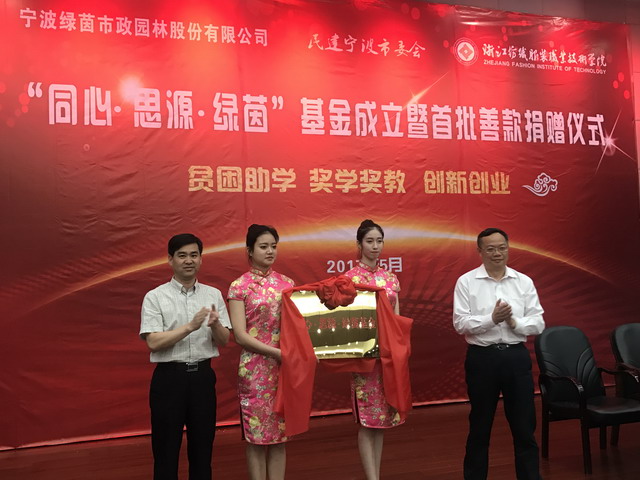 为鼓励学生积极创新、全面发展,促进学校为地方经济培养更多的特色人才,市民建企业家协会副会长、鄞州民建会员、宁波市绿茵市政园林股份有限公司董事长阮冰在浙江纺织服装职业技术学院艺术与设计学院设立了“同心•思源•绿茵基金”,首期捐款20万元,连续三期,主要用于学院贫困助学、奖学奖教、创新创业。