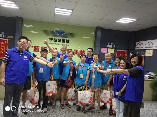 8月20日下午,民建海曙总支部和民建公益促进会代表利用休息时间,提着慰问品,顶着酷暑慰问宁波火车南站蓝精灵志愿者们。