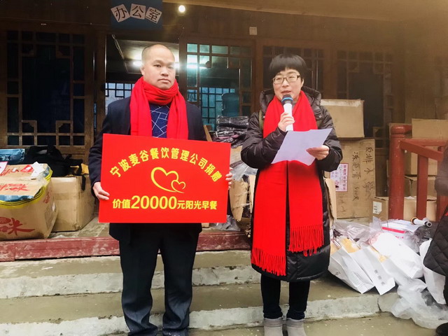 1月6日,党的十九大代表、北仑胡朝霞带领爱心团队远赴贵州,展开为期4天的助学之旅。这次爱心团队到贵州助学,共筹集到善款8万元,爱心物资价值27万余元,羽绒服等过冬物资寄往贵州,书籍、围巾、零食等由爱心团队队员带到贵州。北仑四支部会员,宁波麦谷餐饮管理有限公司郑永光总经理向贵州捐赠20000元,用于资助贵州贫困小学的爱心早餐。