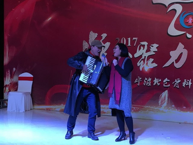 参加活动的民建会员与医护人员欢聚一堂,共同欣赏了一台,由医院医护人员自编自演精彩晚会。其中,一支部会员裴发邦和杨丽霞合作,为大家表演了手风琴弹唱《敖包相会》,将晚会带入了高潮。大家在欢声笑语中共同回忆过去一年的努力与欢乐,畅想2018年的新发展,度过了愉快的一晚。