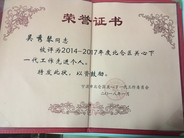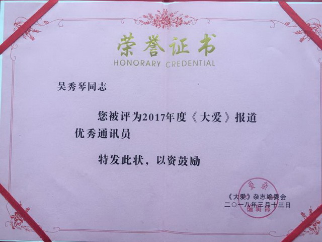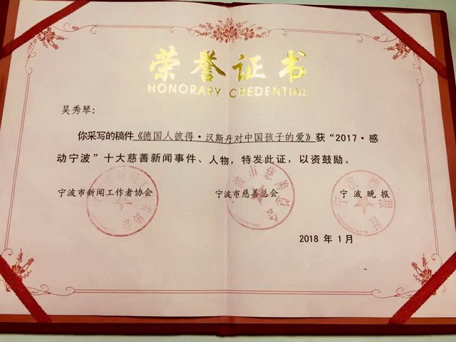 近日,在宁波市慈善总会召开的2017年度慈善宣传报道工作座谈暨表彰会上,吴秀琴获得优秀通讯员荣誉称号。此外,由她采访撰写的《德国人彼得·汉斯丹对中国孩子的爱》获得由宁波市新闻工作者协会、宁波市慈善总会和《宁波晚报》组织评比的“2017·感动宁波十大慈善新闻事件”。在今年年初,她也被评为“2014-2017年度北仑区关心下一代工作先进个人”。她多年来从事社会公益慈善宣传工作得到了广泛认同。