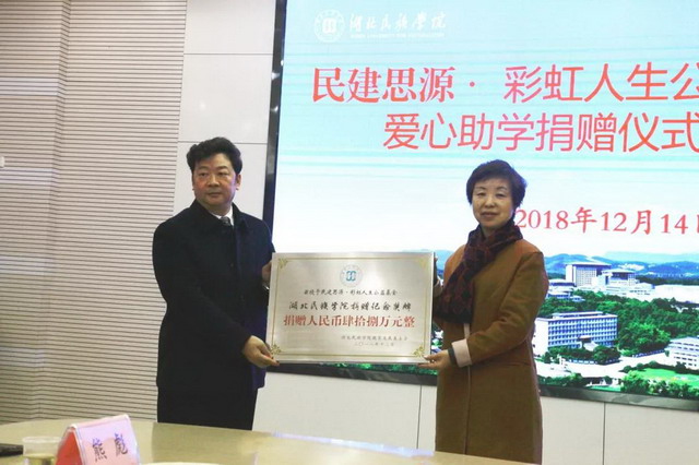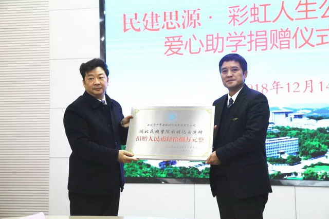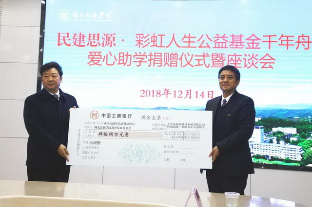 湖北民族大学位于湖北省恩施州,是经教育部批准,以本科教育为主的省属普通本科院校,是湖北省重点建设高校,是湖北省政府和国家民委共建学校。学校大部分学生来源于经济欠发达地区,建档立卡贫困学生多达2200余人,这部分学生虽然每年都有国家和学校通过奖、助、贷等多种途径的资助,但仍有相当一部分学生在校生活非常困难。民建会员企业千年舟新材科技集团热心公益,慷慨解囊,通过民建思源·彩虹人生公益基金捐赠48万元,用于资助30名湖北民族大学恩施籍建档立卡贫困家庭大一学生,帮助这些优秀贫困学子完成四年大学学业。